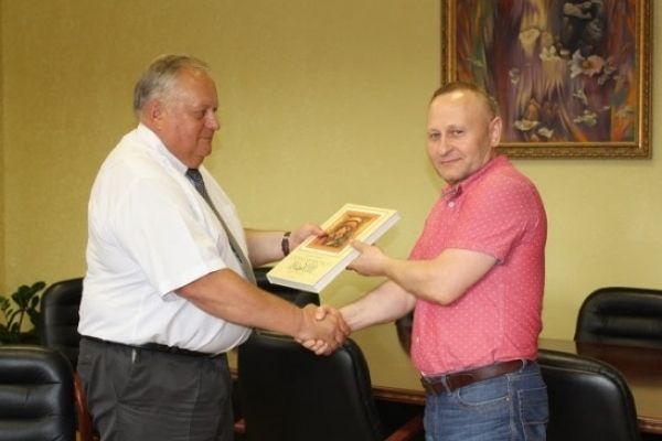Міський голова Рівного після відпустки вирішив розпочати роботу з прищеплення у Рівному добрих традицій. На фото видно, як Володимир Хомко передає книгу «Історія української ікони» Дмитра Степовика для сервісного центру МВС в м.Рівне.