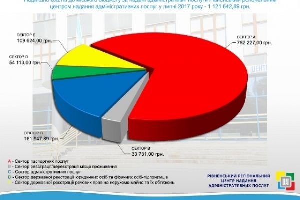 Загалом надійшло коштів до міського бюджету за надані адміністративні послуги Рівненським регіональним центром надання адміністративних послуг за липень 2017 року:
