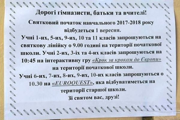 «11-класники готують перший дзвоник для першачків, які сидітимуть на стільцях, та 5 і 9-класників. Скажімо, вчителі вирішили відійти від стандартних урочистостей. Решта інформації – у оголошенні”, – йдеться у повідомленні рівнянки.