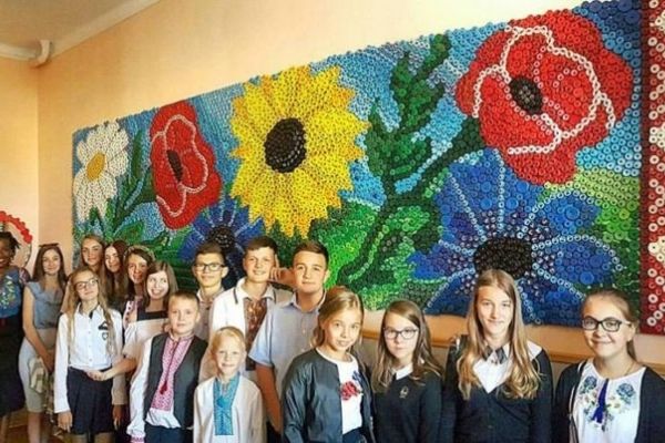 На Рівненщині у Здолбунівській гімназії презентували панно в українських національних мотивах, створене з різнокольорових пластикових кришечок.