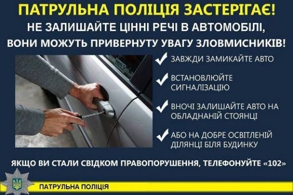 Задля зменшення ризику стати жертвою зловмисників, закликаємо водіїв не залишати цінних речей у салоні автомобіля.