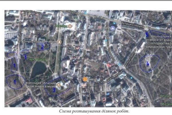 Дослідження проводилися на таких об’єктах: трьох ділянках в Парку молоді, на схід та північний схід від стадіону; ділянці, що прилягає до Рівненської обласної бібліотеки; території навколо Рівненського обласного краєзнавчого музею, території в західній частині Парку Шевченка, в районі проведення археологічних розкопок, території в північно-західній частині Парку Шевченка, що прилягає до вулиці Соборної.