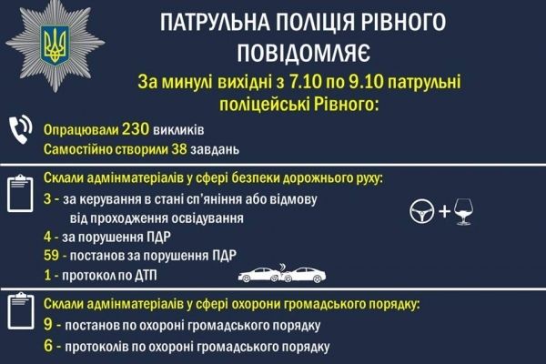 За вихідні патрульні опрацювали двісті тридцять викликів. Склали три протоколи на нетверезих водіїв та один раз виїжджали на місце ДТП, де також склали адмінматеріал.