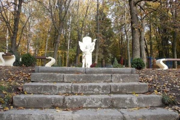 А це що таке виліпили з незрозумілого матеріалу, який за два дні після відкриття почав сипатись тим набілом, що його помастили… Що це за символ – худий, змучений, із заплющеними очима, з якоюсь пов’язкою на бедрах? Якщо це янгол, то й за нього образа бере… А поруч лавочки-закарлючки і 5 східців, що сікось-накось поставили…