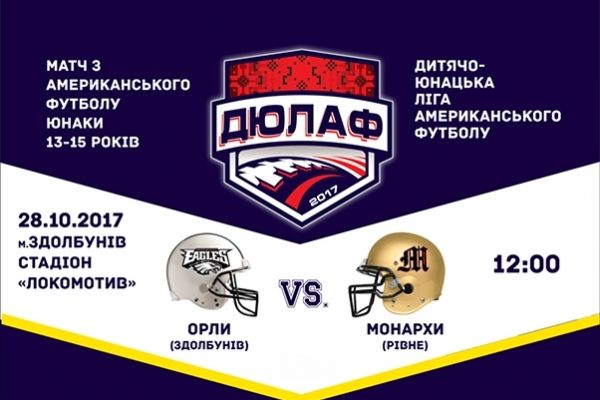 28 жовтня, в суботу, о 12-00 на місцевому стадіоні «Локомотив», пройде черговий тур ДЮЛАФ. В цьому поєдинку здолбунівські “Орли” прийматимуть рівненських “Монархів”. Нагадаємо, що минулої суботи Орли в важкому поєдинку здобули перемогу над вінницькими “Вовками” і зайняли другу сходинку турнірної таблиці.