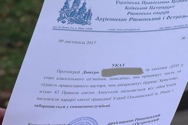 «Священика» Дмитра за вчорашню ДТП біля Антополя вже звільнили з посади настоятеля храму. Також заборонили йому проводити служби і обряди. Питання про позбавлення сану вирішуватиме Синод. Ось як можна відсвяткувати день Ангела. Інформація офіційна від прес-служби Єпархії,» – пише власкор НТН Світлана Прокопчук.