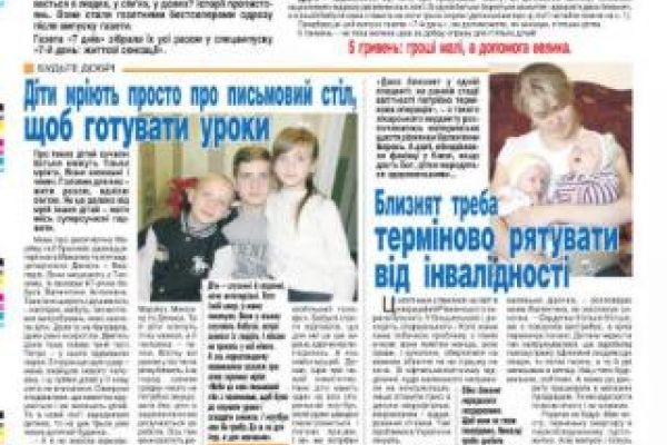 Є у Рівному п’ятеро дітей, яким можна допомогти всього за 5 гривень. Сьогодні редакція газети «7 днів» випустила спецвипуск «Сьомий день» на користь саме цих дітей. Один примірник газети коштує 5 гривень. Гроші малі, а допомога велика.