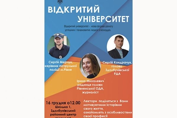 «Відкритий університет» – це нова форма діалогу успішних й талановитих людей з молоддю. Лектори поділяться історіями свого життя, ознайомлять з особливостями професії та доведуть, що в Україні також можна стати успішними.