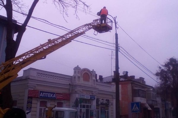Електрики встановлюють опору та вмикають мережу. працівники міськШЕУ демонтують пошкоджену огорожу.