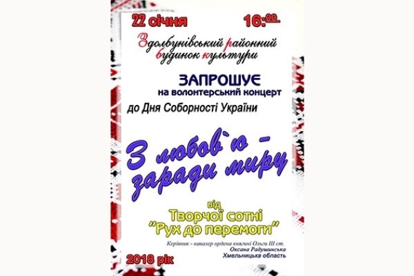 Волонтерський концерт «З любов’ю заради миру» від Творчої сотні «Рух до перемоги» відбудеться у Здолбунівському РБК 22 січня.