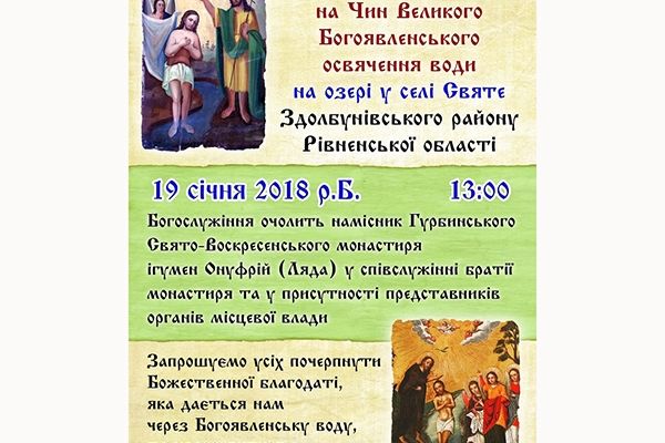 Богослужіння очолить намісник Гурбинського Свято-Воскресенського монастиря ігумен Онуфрій (Ляда) у співслужінні братії монастиря. Усіх бажаючих почерпнути Божественної благодаті, яка дається нам через Богоявленську воду, та уздоровитися тілесно і духовно.