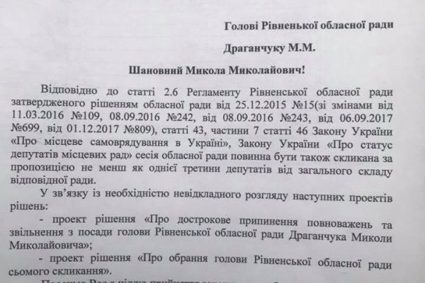«Сьогодні у Рівненській обласній раді за ініціативи 23 депутатів зареєстровано офіційне звернення на ім’я голови облради Миколи Драганчука з вимогою скликати позачергову сесію Рівненської обласної ради, призначивши її засідання на 2 лютого 2018 року.