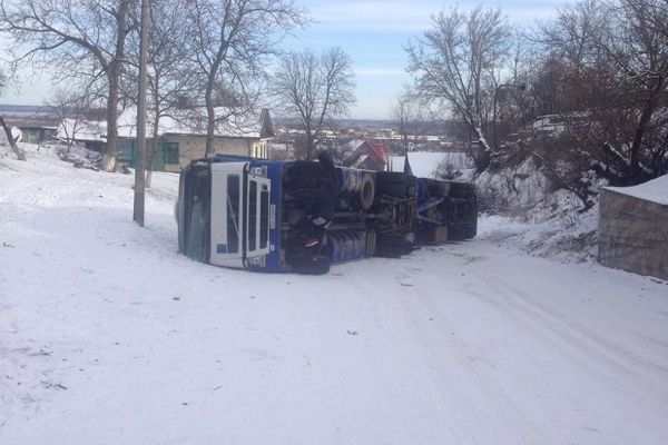 Сьогодні в Острозі по вулиці Красногірській перекинулася вантажівка. Світлину автівки опублікували на сайті «Район.Острог».
