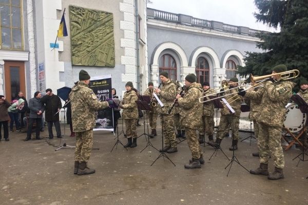 Сьогодні у Рівному на залізничному вокзалі грав духовий оркестр. Таким чином військові музиканти з оперативного командування “Захід” долучилися до всеукраїнського флеш-мобу, присвяченого 100-річчю бою під Крутами.