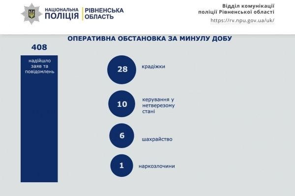 Рівненська поліція інформує: за добу 408 повідомлень про правопорушення (Інфографіка)