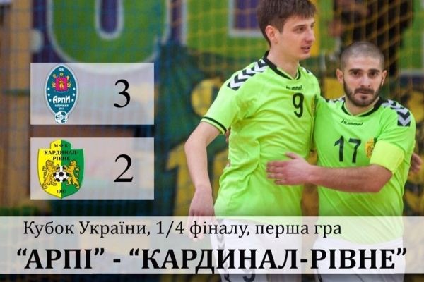 Рівненський “Кардинал” у першій чвертьфінальній грі Кубка України у Запоріжжі поступився першоліговому клубу “АРПІ”. Рівняни спочатку програвали – 0:1, потім перемагали – 2:1, але зрештою поступилися – 2:3.