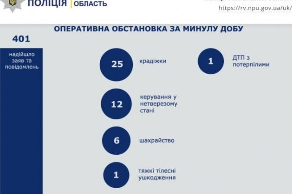 За минулу добу до поліції Рівненської області надійшло 401 повідомлення про вчинені кримінальні правопорушення та інші події.