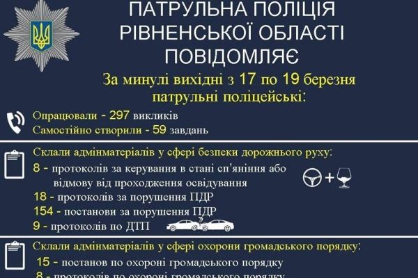 Патрульні поліцейські прозвітували про свою роботу на вихідних. Зокрема, вони склали вісім адміпротоколів за керування в стані сп`яніння або відмову від проходження освідування.