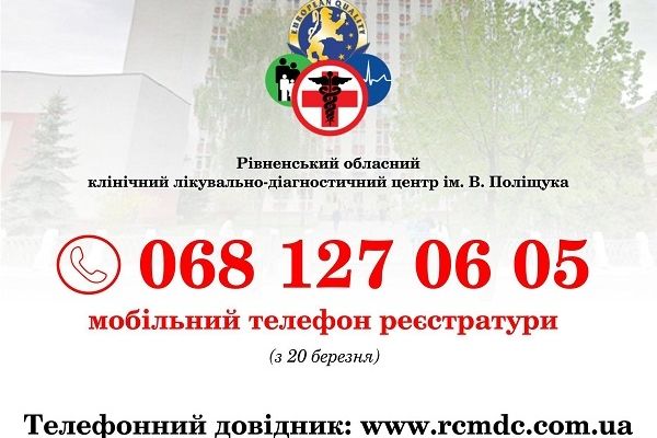 З 20 березня у реєстратурі Рівненського обласного клінічного лікувально-діагностичного центру ім. В. Поліщука запрацює мобільний номер для отримання довідкової інформації та реєстрації пацієнтів: +380681270605.