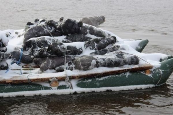 При огляді місцевості в районі затримання транспортного засобу з м’ясом і перевірки берегової лінії на річці був виявлений пліт, на якому знаходилися 35 туш телятини, мішок з шматками м’яса.