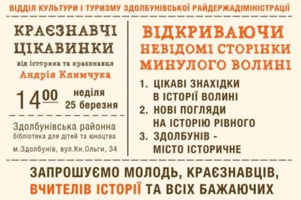 Зустріч пройде в Здолбунівсьій районній бібліотеці для дітей та юнацтва (м. Здолбунів, вул. Кн. Ольги, 34) всіх бажаючих відкрити невідомі сторінки минулого Волині, а саме: