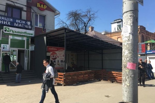 В районі Пивзаводу підприємець вже відгородив частину території біля приміщення банку та встановив накриття.