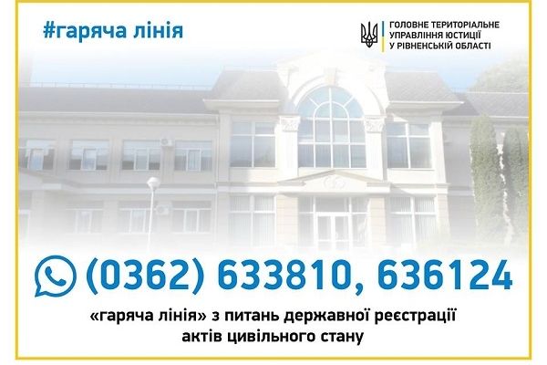 Для оперативного надання громадянам консультацій у сфері державної реєстрації актів цивільного стану у відділі державної реєстрації актів цивільного стану Управління державної реєстрації Головного територіального управління юстиції у Рівненській області запроваджено пряму телефонну «гарячу лінію».