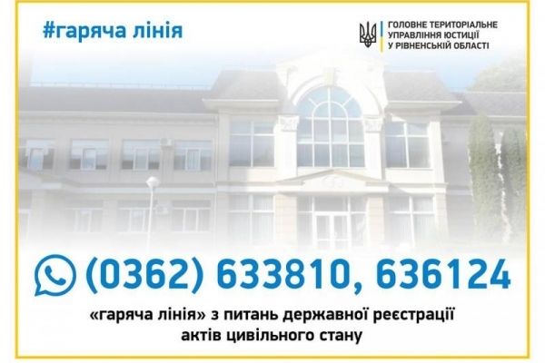 Для оперативного надання громадянам консультацій у сфері державної реєстрації актів цивільного стану у відділі держреєстрації актів цивільного стану Управління державної реєстрації ГУ Юстиції у Рівненській області запрацювала «гаряча лінія».