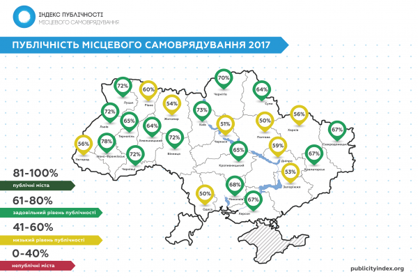 Довідково: впродовж лютого-квітня 2018 року в усіх обласних центрах України, а також у містах Краматорськ і Сєвєродонецьк проводилося п`яте вимірювання Індексу публічності місцевого самоврядування. Дослідження передбачало подання та опрацювання відповідей на інформаційні запити, аналіз контенту офіційних веб-сайтів та друкованих видань муніципалітетів, моніторингові візити та безпосереднє спостереження за роботою органів та посадових осіб місцевого самоврядування, опрацювання місцевих нормативно-правових актів. Результатом проведеної кампанії є публікація щорічного всеукраїнського дослідження – «Індекс публічності місцевого самоврядування 2017».
