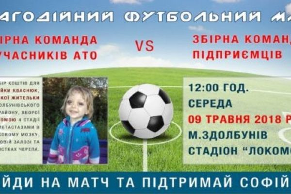 Дев’ятого травня у Здолбунові на стадіоні «Локомотив» відбудеться благодійний футбольний матч між командами підприємців та учасників бойових дій і АТО Здолбунівщини. Початок футбольного матчу – о 12.00.
