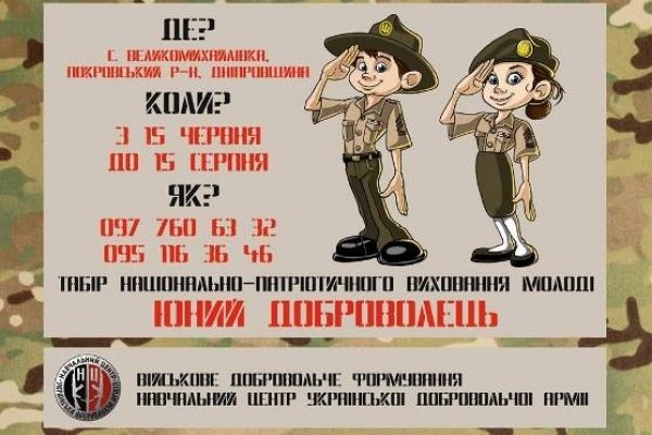 Навчальний центр Української добровольчої армії запрошує всіх охочих взяти участь у таборі національно-патріотичного виховання молоді «Юний доброволець», де, крім основної навчальної програми, що включає в себе з десяток дисциплін індивідуальної підготовки добровольця, учасники отримають практичні навики тактики бою та виживання на війні.