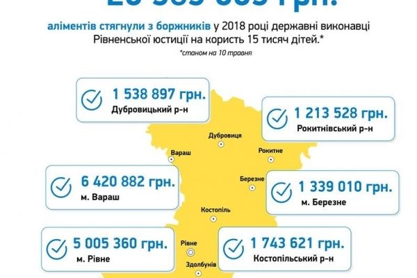 26 мільйонів гривень аліментів стягнули у 2018 році державні виконавці Рівненської юстиції на користь більше 15 тисяч дітей. З них, у зв’язку із застосуванням до боржників новацій Закону “Чужих дітей не буває” – більше10 тисяч гривень.