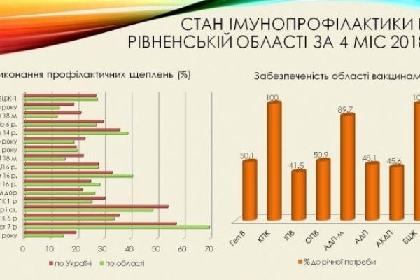 У Рівненській області ряд профілактичних щеплень виконуються не належним чином. На низькому рівні залишається виконання щеплень проти дифтерії, правцю та кашлюку. За 4 місяці поточного року в області АКДП вакциною вакциновано 18,7% дітей першого року життя, найгірше виконуються щеплення у м. Вараш (7,1%) та Костопільському (8,1%) і Острозькому (8,7%) районах. Ревакцинацію АКДП отримали 15,4% дітей у віці 18 місяців, незадовільне виконання у Березнівському (9,7%) районі та мм. Вараш (6,4%) і Дубно (6,7%).