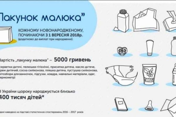 З 1 вересня 2018 року батьки новонароджених отримають додаткову допомогу від держави – «пакунок малюка». Кожна мама отримає в пологовому будинку для своєї дитини пакунок з найнеобхіднішими для малюка речами – це одяг, підгузки, ковдри, дитяча олійка та крем, присипка, пляшечка, соска, пустушка, серветки, пелюшки, термометр, а також навчальні матеріали щодо догляду за дитиною. Кожна дитина, з 400 тисяч, які щороку народжуються в Україні, отримає від держави речі, які потрібні в перші дні життя.