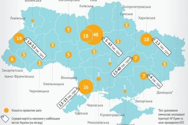 Загалом, по Україні налічується понад 170 приватних освітніх закладів. Попереду йде Київ, в якому налічується 48 таких навчальних закладів. Другою за кількістю недержавних шкіл іде Одеса та область – там 26 таких шкіл, а Київська область і Харків з областю поділили третє місце – по 18 приватних шкіл.