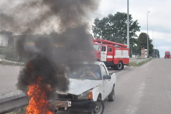 За легендою автомобіль врізався у відбійник і зайнявся. З автівки евакуювали умовно постраждалого водія.