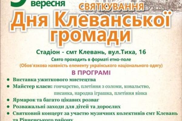 Свято проходитиме у форматі етно-поля. Отож обов’язковими мають бути атрибути українського одягу. Усіх, хто завітає на свято, чекають виставки, ярмарок, концерти та просвітницька галявина. Дійство проходитиме на стадіоні. Початок о 15.00. Про це інформує сайт Клеванської ОТГ.