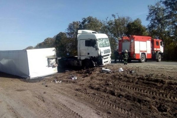 А вже в обідню пору перекинулася вантажівка DAF на трасі Київ-Чоп поблизу села Велика Омеляна Рівненського району. Піднімали її ті ж рятувальники, що і попередню машину. Також вогнеборці змивали паливно-мастильні матеріали з проїжджої частини дороги.