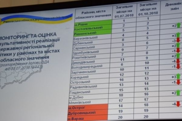 Відтак трійку лідерів відкриває місто Рівне, другу позицію займає Костопільський район, третю сходинку посідає Рівненський район. Такі результати загальнообласного рейтингу за соціально-економічним розвитком міст та районів Рівненської області впродовж 9 місяців. За словами заступника голови Рівненської облдержадміністрації Ігоря Тимошенка, рейтинг складали за 32 критеріями та 7 напрямками.