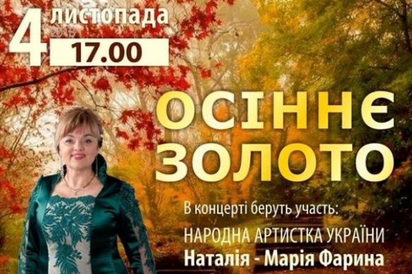 “Осіннє золото”. У ньому беруть участь: народна артистка України Наталя-Марія Фарина, академічний камерний оркестр Рівненської філармонії – диригент Юрій Скрипник, Володимир Полторацький (вокал, м. Вінниця) , концертмейстер Ірина Козачук, інформує сайт Рівненської обласної філармонії.