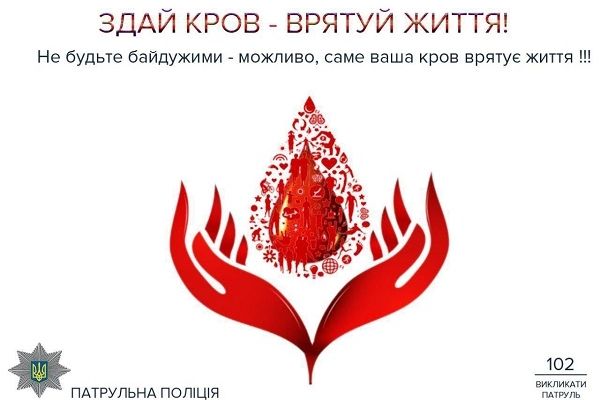 Патрульна поліція запрошує прийти сьогодні, 14 листопада, до обласної станції переливання крові (вулиця Бандери, 31) та долучитися до благодійної здачі крові в рамках загальнонаціональної акції “Здай кров – врятуй життя” з метою допомоги постраждалим у ДТП.