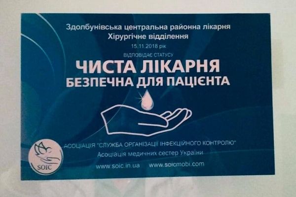 Хірургічне відділення Здолбунівської центральної районної лікарні отримало знак «Чиста лікарня – безпечна для пацієнта». Про це повідомив головний лікар медзакладу Владислав Сухляк на своїй сторінці у Фейсбуку.