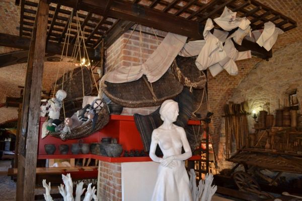 А ще у замку розгорнуто чимало цікавих експозицій. Юні відвідувачі одразу й надовго прикипають до саркофага зі скелетом воїна-велета, який загинув у бою декілька століть тому, обороняючи замок. Я ж просто вмлівала від вишивок, скринь і старих меблів! Були кімнати, де, здається, і жила би. Застелила давню софу домотканими простирадлами, розклала би на ній вишиті ясіки, закуталася б у рябеньке ряденце – і читала б щось цікаве чи розглядала ніжку стола у вигляді чи то собаки, чи вовка, або просто мріяла, вдивляючись у химерну ліпнину на високих стелях. Дивлячись на рівні і штивні узори на домотканому полотні жіночих і чоловічих вишиванок, запитувала лише одне: «Як?!! Як можна було так рівнесенько, так акуратно і зі смаком створити цю красу та ще й під блимання підсліпуватого каганчика чи від скалки у печі?»