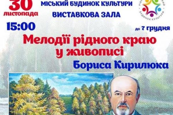 Виставкова зала МБК запрошує усіх на відкриття виставки «Мелодії рідного краю у живописі Бориса Кирилюка», яке відбудеться 30 листопада о 15 год. Для огляду будуть представлені понад 40 робіт, написаних на полотні олійними фарбами, інформує заклад на своїй сторінці у Фейсбук.
