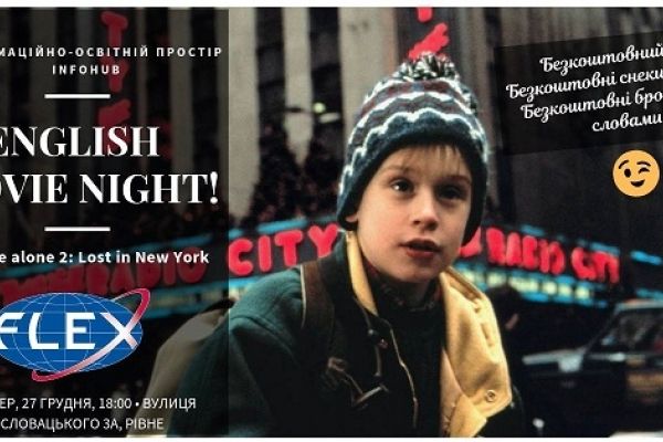 У Рівному в приміщенні «Інфохаб» у четвер, 27 грудня, відбудеться English movie night. Всі охочі переглядатимуть та будуть обговорювати знаменитий фільм «Home alone 2: Lost in New York».