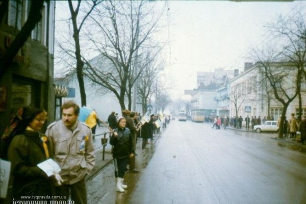Перший “живий ланцюг” в Україні патріотичні сили організували 21 січня 1990 року. Він простягнувся між Києвом, Львовом та Івано-Франківськом як символ духовної єдності людей східних і західних земель України. Зі Стрия жива шеренга прямувала до Львова, звідти – до Тернополя.