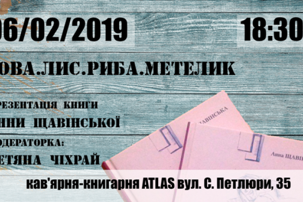 Кав’ярня-книгарня “Atlas” та видавництво “Лілея-НВ” запрошують на презентацію книги Анни Щавінської “Сова.Лис. Риба.Метелик”, яка відбудеться у середу, 6 лютого. Початок – о 18:30. Модераторка – Тетяна Чіхрай.