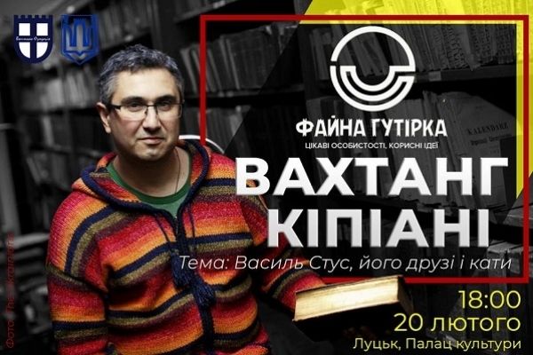 20 лютого, 18.00 в Палаці культури Луцька (2 поверх) відбудеться Файна гутірка за участі Вахтанга Кіпіані. Говоритимуть про Василя Стуса, його друзів та ...катів. Модератор Леся Бондарук. Вхід - вільний. Організатор гутірки Волинська Фундація та Центр національно-патріотичного виховання дітей та молоді у м. Луцьк.