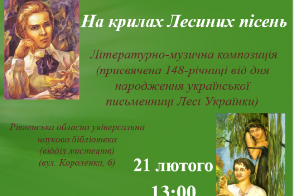21 лютого о 13 год. у відділі мистецтв бібліотеки відбудеться літературно-музична композиція «На крилах Лесиних пісень», присвячена 148-й річниці від дня народження української письменниці, перекладачки, культурної діячки Лесі Українки, інформує сайт книгозбірні.