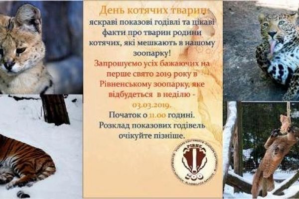 У неділю, 3 березня, об 11 год. у зоопарку відбудеться свято, приурочене до Всесвітнього дня котів, який відзначають у світі 1 березня. Обіцяють багато цікавинок, інформує Рівненський зоопарк на своїй сторінці у Фейсбук.